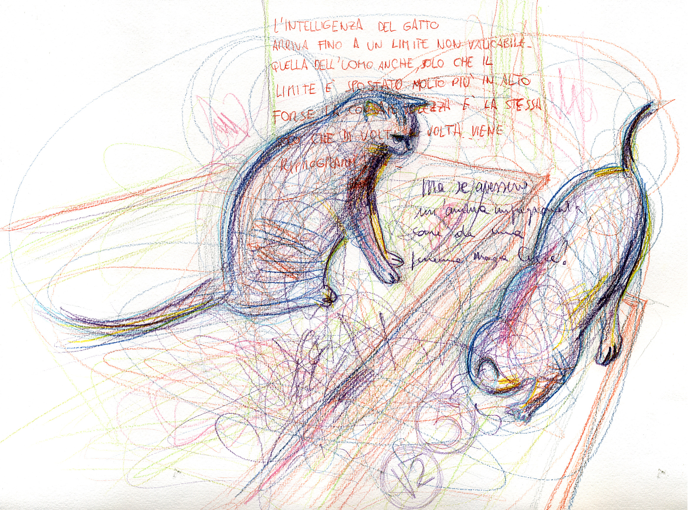 L’intelligenza del gatto arriva fino a un limite non valicabile. Anche quella dell’uomo, solo che il limite è spostato molto più in alto. Forse la consapevolezza è la stessa, solo che di volta in volta viene riprogrammata. Ma se i gatti avessero un’anima umana imprigionata da una onnipresente maga Circe?